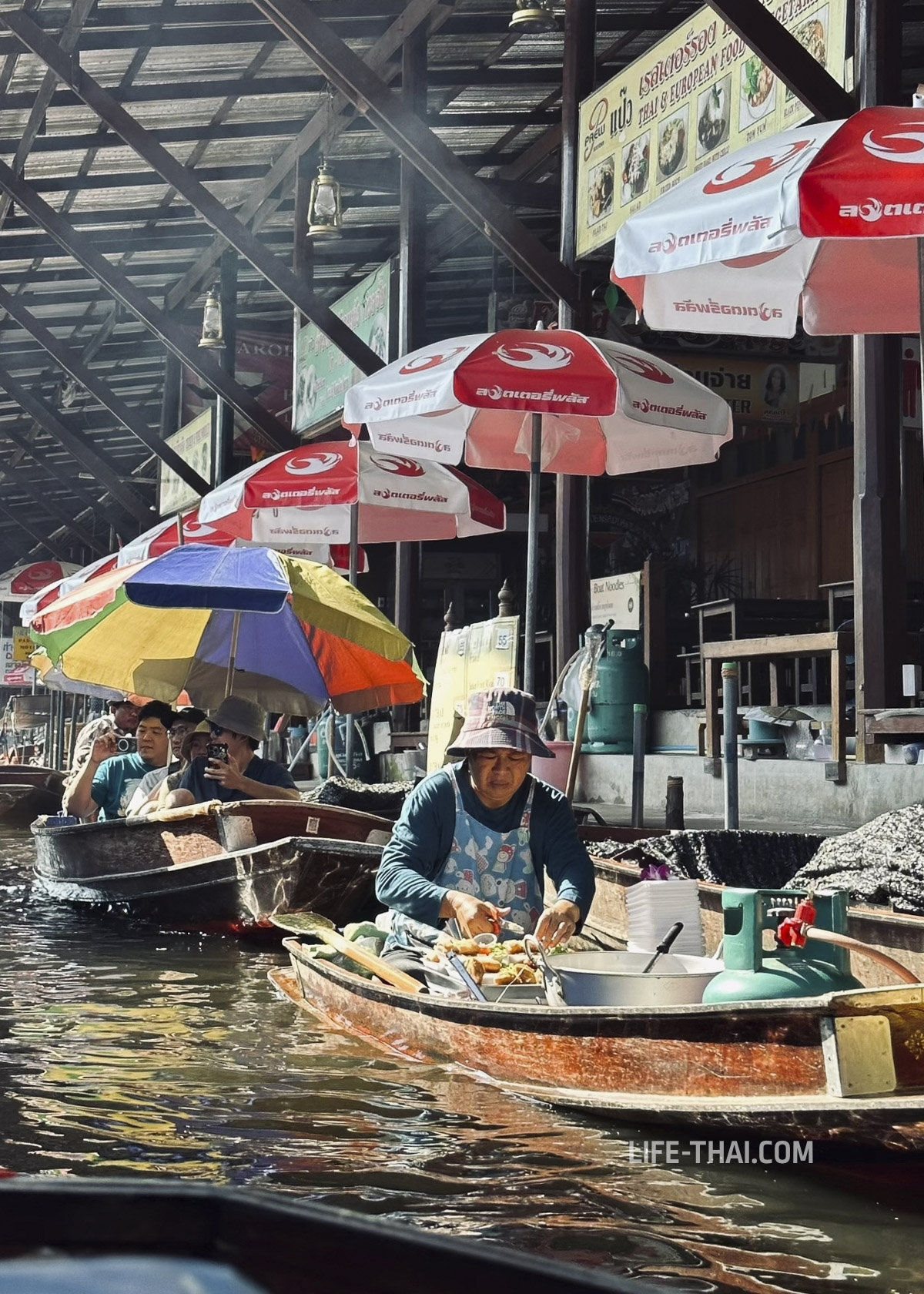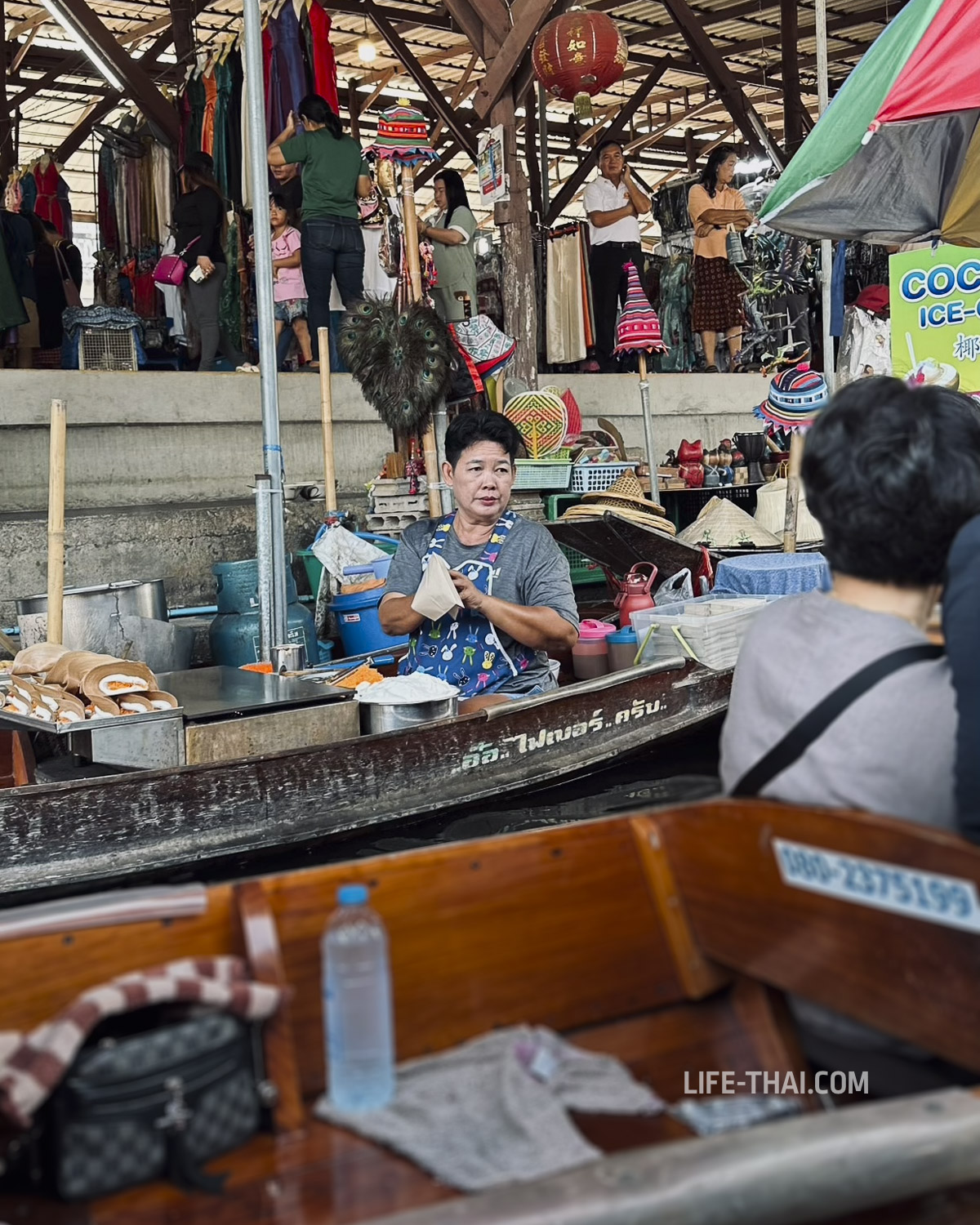 Самый сок рынка в хаосе на воде. В часы пик (с 8:00 до 10:00 утра) лодки буквально застревают в «пробках», и торговля идет борт к борту. Здесь принято покупать еду прямо с лодок: кокосовое мороженое, клейкий рис с манго или лапшу, которую готовят на крошечных плитках прямо в качающемся лодке-челне.