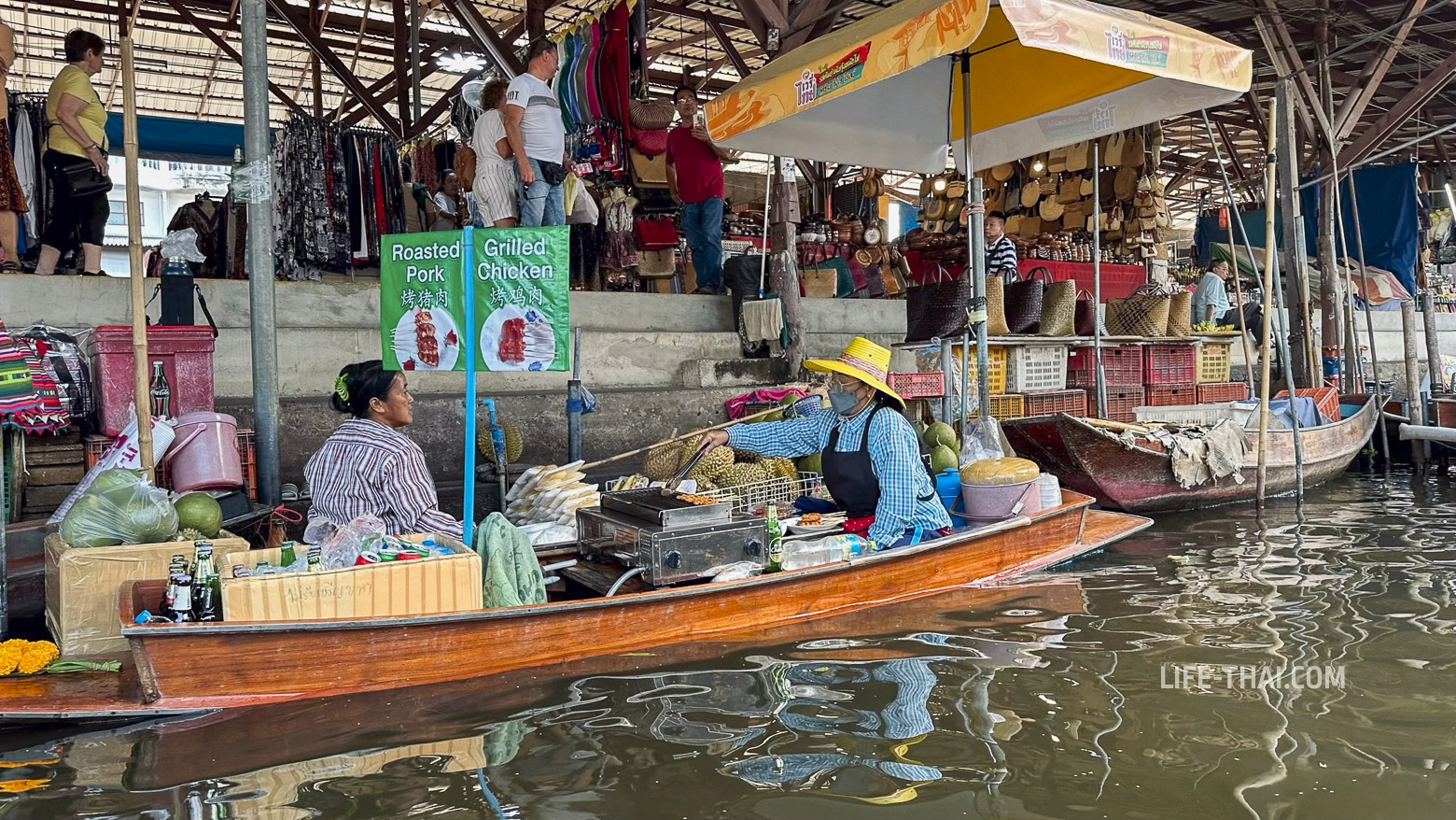 Если Дамноен Садуак ориентирован на иностранных туристов, то Ампхава — это любимое место отдыха самих тайцев, которые приезжают сюда из Бангкока на выходные. Главная причина, по которой Ампхава так популярна среди тайцев, это морепродукты. Фишка рынка — огромные речные креветки, гребешки, рыба и моллюски, которые готовят на гриле прямо в лодках. Вот как это выглядит: