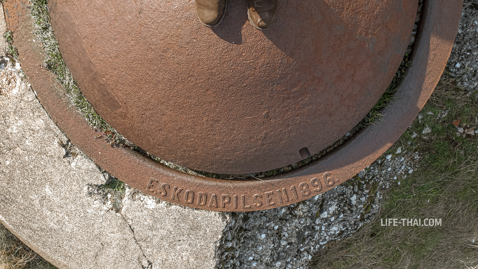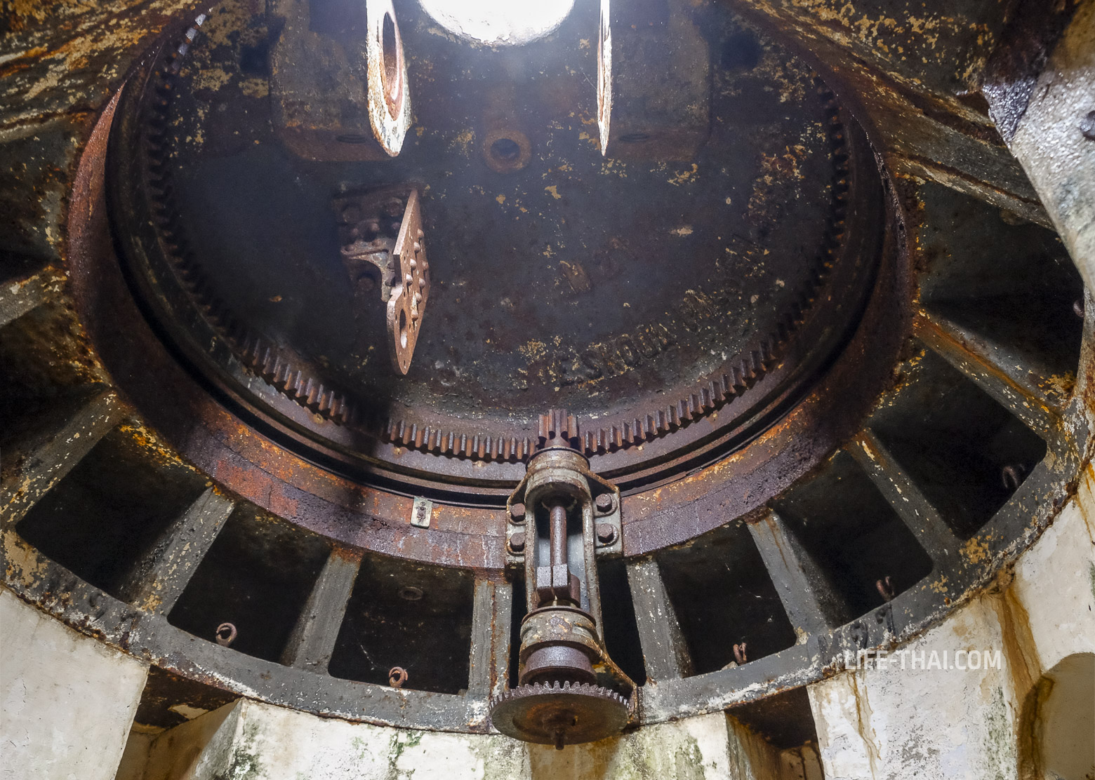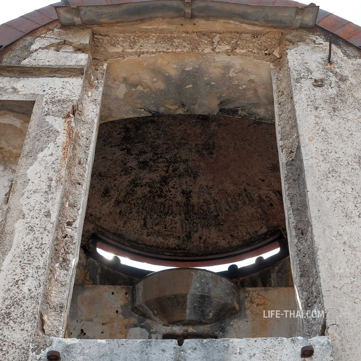- Главное: Уникальный вращающийся бронекупол Грюзона (Gruson-Panzerlafette), внутри которого стояло два 120-мм ствола на хитром поворотном механизме. Сейчас всё демонтировано, а бойницы, как видно на фото, заделаны. Обслуживали такое орудие 3 человека: двое солдат вращали, офицер стрелял. Хоть у крепости Горажда есть сестра-ближняшка в Хорватии (город Пула), черногорский бронекупол Грюзона — единственный сохранившийся экземпляр такой конструкции в мире. С воздуха он выглядит как огромный глаз, смотрящий в сторону залива.