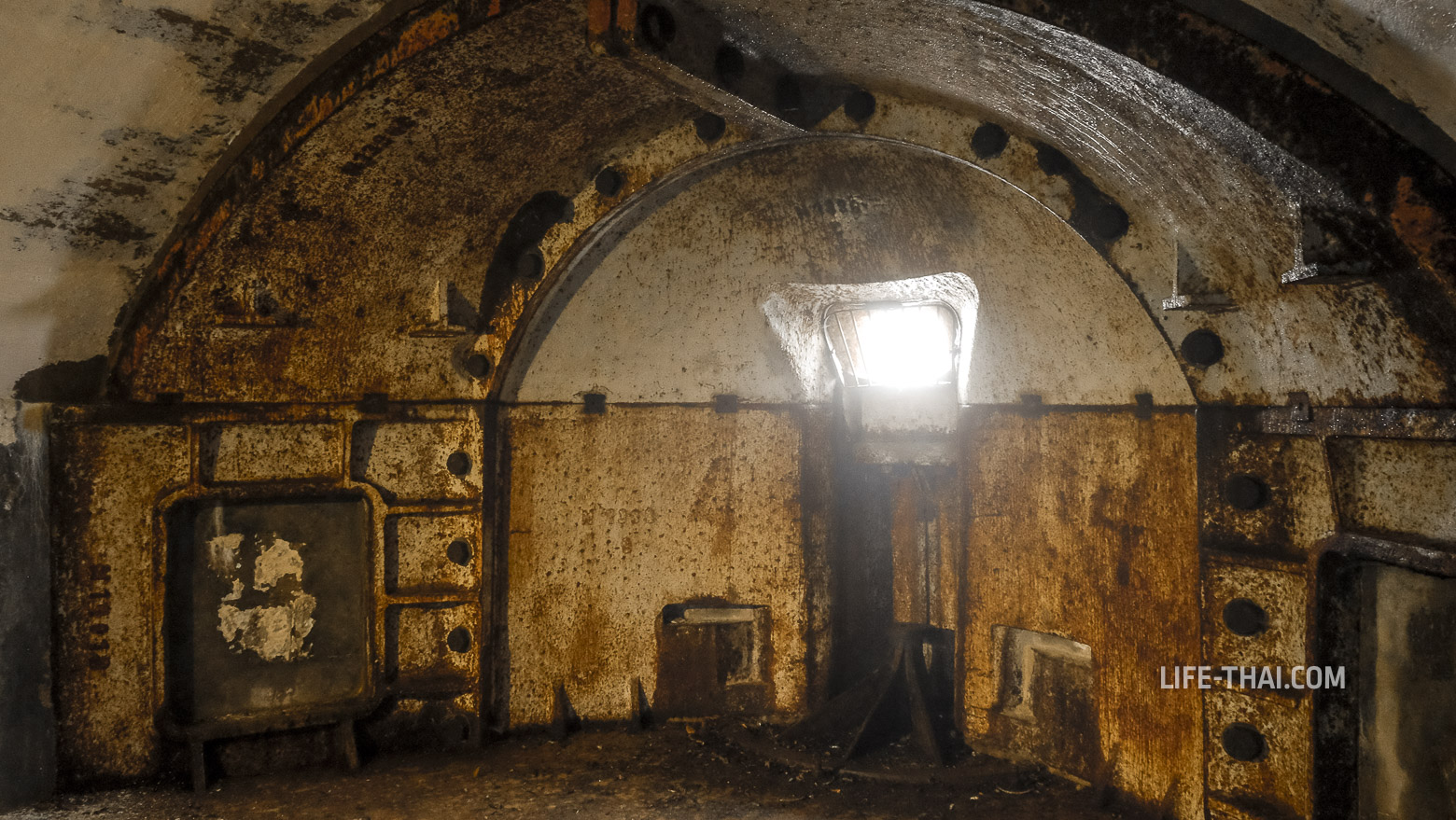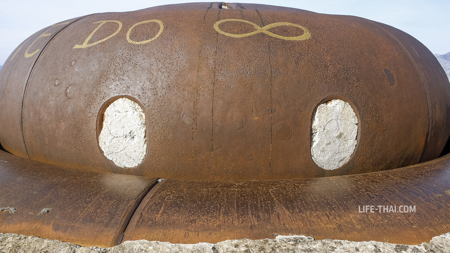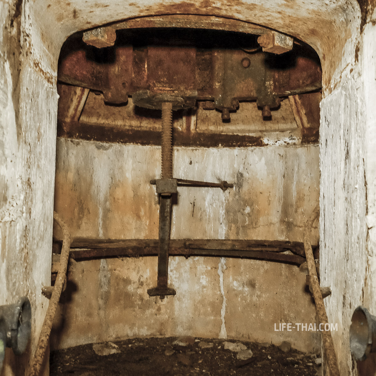 - Главное: Уникальный вращающийся бронекупол Грюзона (Gruson-Panzerlafette), внутри которого стояло два 120-мм ствола на хитром поворотном механизме. Сейчас всё демонтировано, а бойницы, как видно на фото, заделаны. Обслуживали такое орудие 3 человека: двое солдат вращали, офицер стрелял. Хоть у крепости Горажда есть сестра-ближняшка в Хорватии (город Пула), черногорский бронекупол Грюзона — единственный сохранившийся экземпляр такой конструкции в мире. С воздуха он выглядит как огромный глаз, смотрящий в сторону залива.