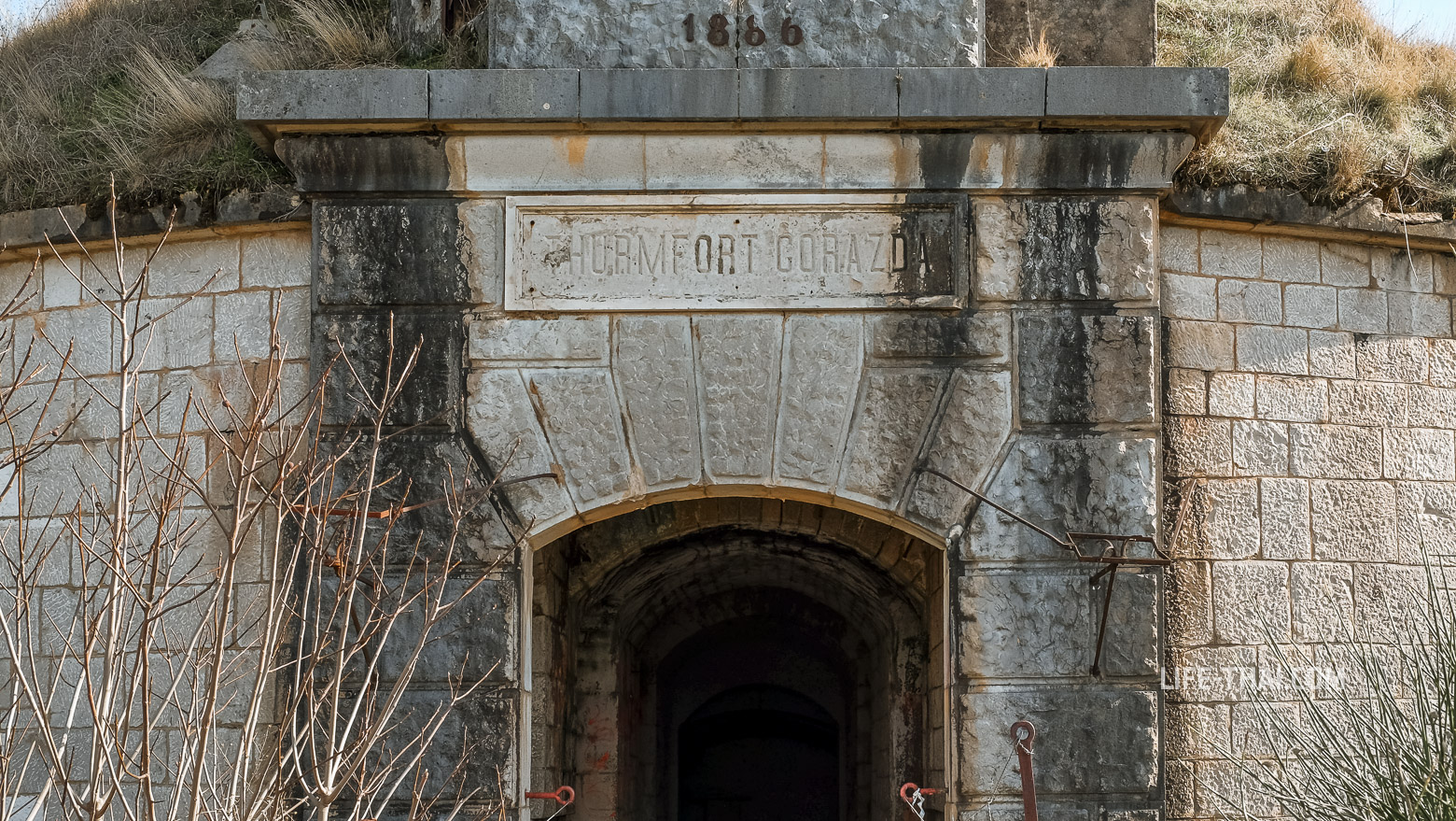 - Архитектура и мощь: Арза представляет собой массивную двухъярусную башню (капонир) с толстыми каменными стенами и узкими бойницами. Австрийцы строили её из местного серого камня так качественно, что за 150 лет она почти не изменилась.