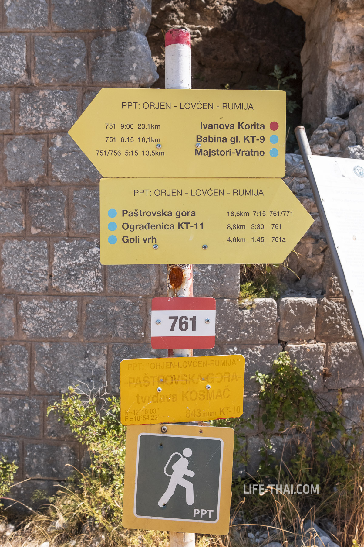 - Как добраться: подъехать к крепости на авто нельзя. Есть два варианта пешего подъема — от Пераста или из Ораховца через форт Шаник (об этом ниже). В Пераст или Ораховац можно приехать на автобусе Blue Line или на авто. Машину можно оставить на парковке в Перасте или у начала тропы на верхней трассе. Идти нужно по маркированной тропе «Vrmac — Lovcen».
