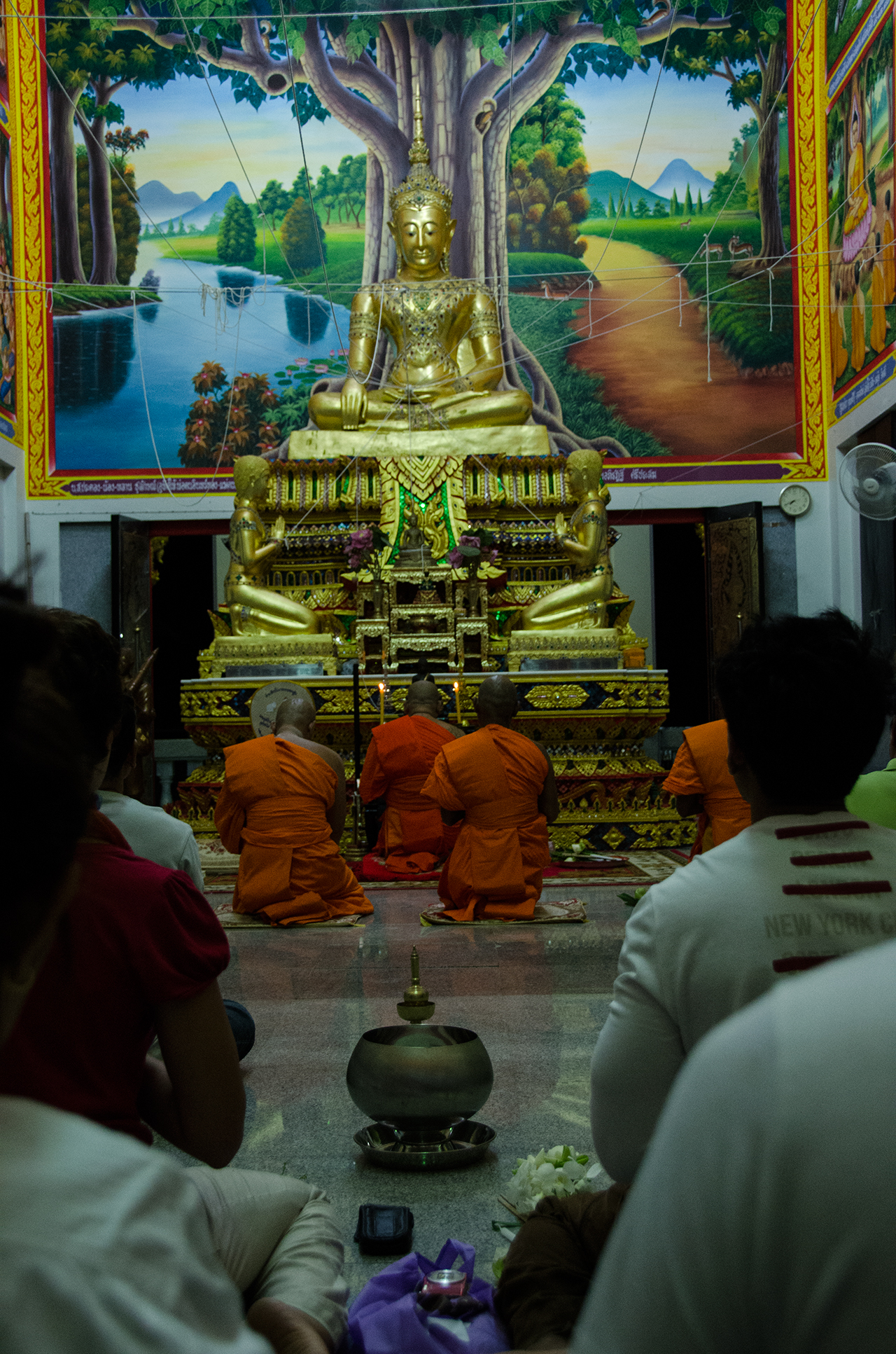 В промежутке между молитвами прихожане угощали монахов едой и делали пожертвования. Это засчитывается в карму как доброе дело. Так же добрым делом считается выпустить птицу из клетки (а мы-то голову ломали, почему все тайцы вокруг вдруг обзавелись клетками с птицами) или рыбок из аквариума.